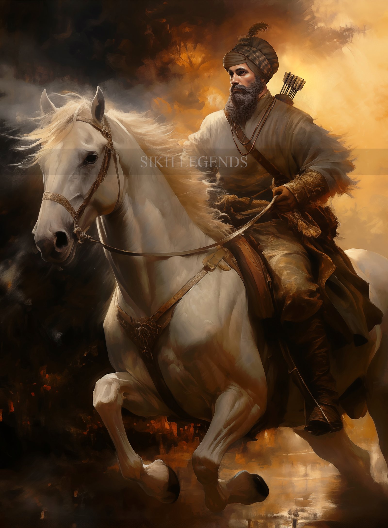 The story suggested by this moment is one of beginnings. “First Dawn” may be read as the quiet hour before decisive action—the emergence of the Khalsa spirit, the moment when resolve becomes movement. Guru Gobind Singh Ji is shown not merely as a warrior riding into battle, but as a visionary leader stepping into a future shaped by justice, sacrifice, and faith. Dawn does not announce chaos; it announces readiness.