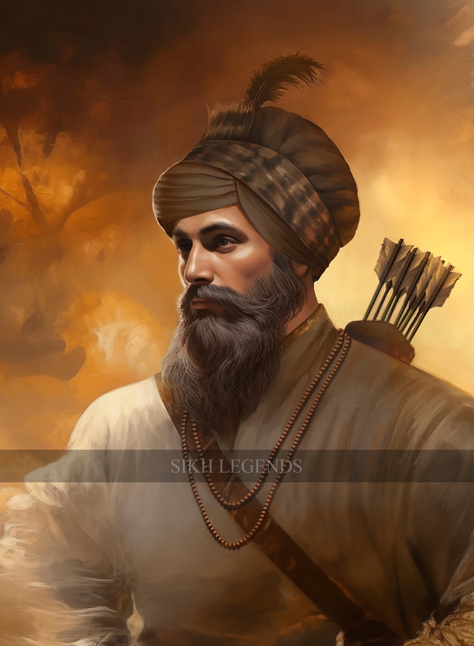 This painting, titled “First Dawn”, presents Guru Gobind Singh Ji in motion at the threshold of a new day, embodying resolve, purpose, and divine leadership. The light of dawn dominates the composition, breaking through shadows in tones of gold, amber, and fire. It symbolizes awakening, renewal, and the birth of a new chapter. The darkness recedes behind the Guru as he moves forward, reinforcing the idea that light follows righteousness.