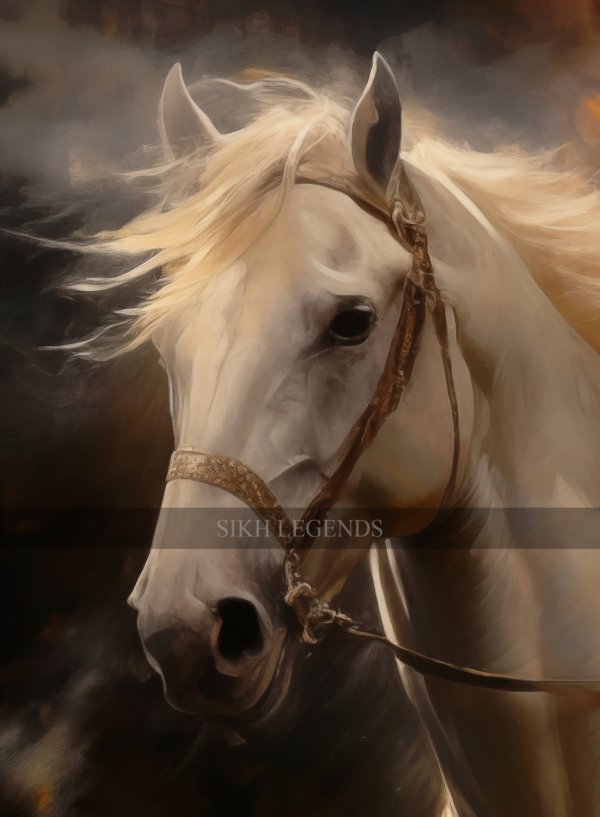 The painting blends dramatic realism with devotional symbolism. The dynamic brushwork and contrast between shadow and illumination give the piece a cinematic intensity, while the restrained color palette keeps it grounded in solemnity rather than spectacle. The flowing mane of the horse and the subtle motion in the Guru’s garments convey forward momentum, while his composed expression anchors the scene in inner discipline. Strength here is guided by clarity, not impulse.