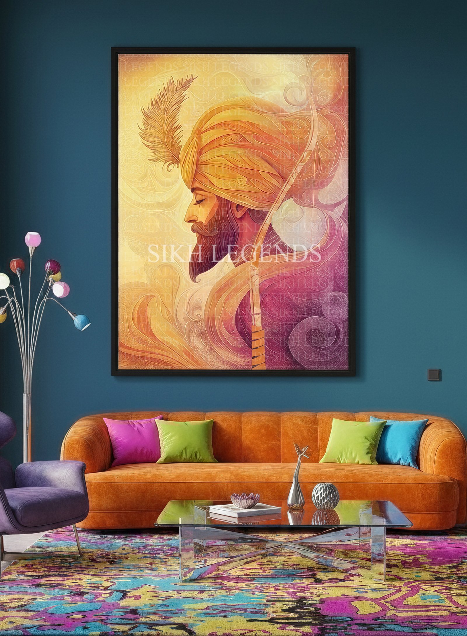 This Giclée Fine Art Edition of Guru Gobind Singh Ji stands as a profound tribute to the Tenth Guru, blending spiritual depth with an unparalleled level of visual sophistication. Unlike standard prints, this Masterwork of Light and Shadow captures the Guru in a moment of quiet, divine intensity, utilising a rich palette of deep ambers and soft golds that seem to radiate from within the composition itself. The intricate details—from the regal structure of his dastaar to the strength reflected in his profile are rendered with a precision that honors the weight of his legacy while presenting a modern, high-definition aesthetic for the discerning collector.