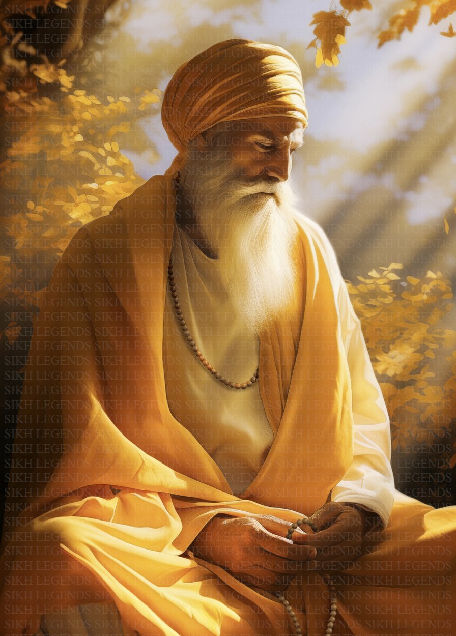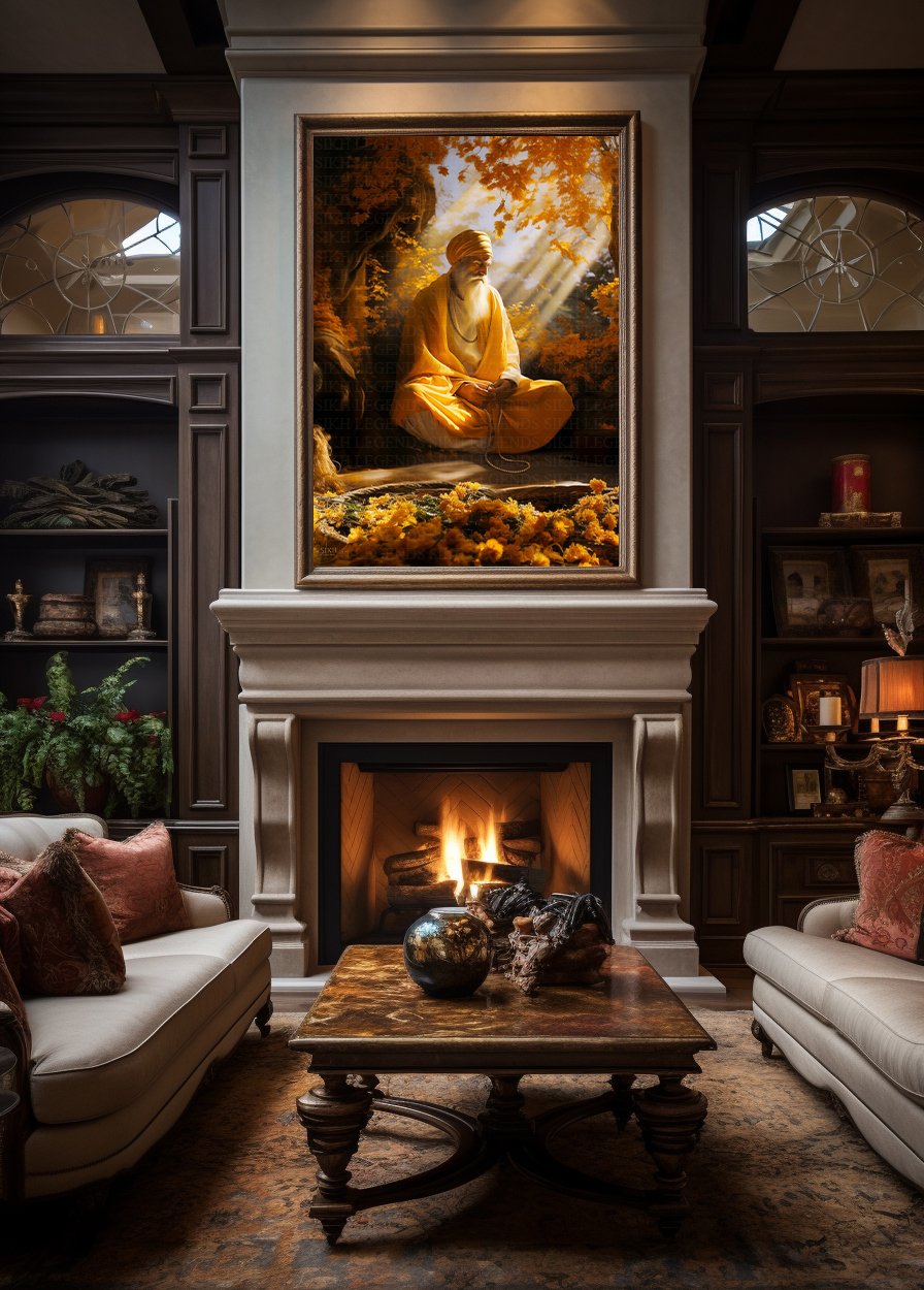Beneath a fiery canopy of autumn leaves, bathed in the sun’s golden kiss, sits Guru Nanak Dev Ji, one with the universe. His eyes, closed in deep meditation. In that sacred space, time stands still, eternity unfolds, and the very essence of “Oneness” finds its purest expression.