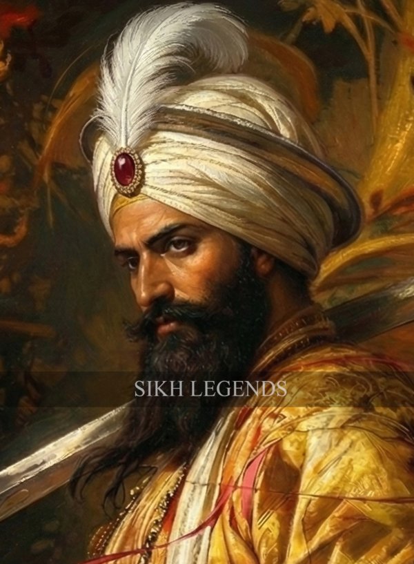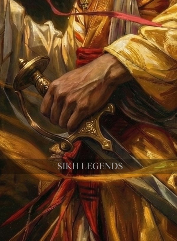This painting captures Guru Gobind Singh Ji at the point where inner fire becomes sacred resolve. He stands poised, blade drawn, not in the chaos of battle but in the storm that lives just beneath the surface of destiny. His expression is fierce yet controlled—eyes steady, jaw set, heart unshaken. This is not anger. This is righteous clarity. The moment feels suspended between breath and action, where the soul has already decided, and the body simply follows.